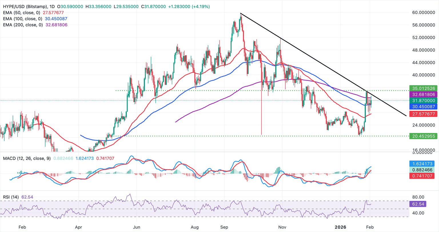 Hyperliquid exhibits stability above $30.00, marking an improvement in technical structure. The token is supported by the 50-day Exponential Moving Average (EMA) at $27.58 and the 100-day EMA at $30.45.