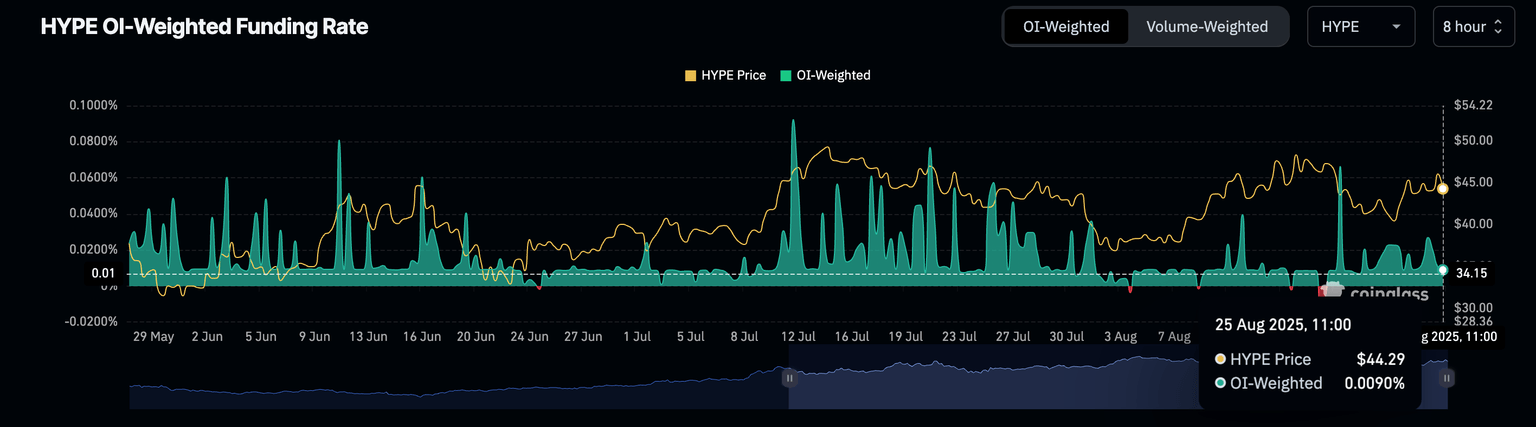 This sustained increase in OI suggests that more traders are betting on short-term price increases. However, traders should tread with caution since the futures funding rate has declined to 0.0090% after peaking at 0.0663% on August 18. In other words, fewer traders are leveraging long positions in HYPE, which could dampen positive market sentiment.