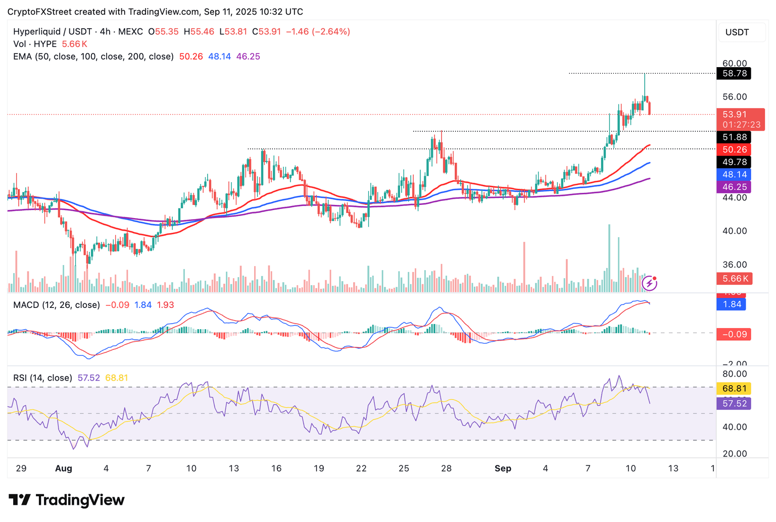Hyperliquid’s rally to a new record high of $58.78 is triggering profit-taking and creating volatility on Thursday. The current technical picture risks extending declines toward $50.00, underpinned by a sell signal from the Moving Average Convergence Divergence (MACD) indicator on the 4-hour chart.