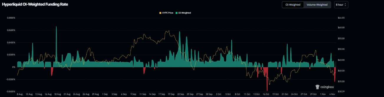 Apart from whale accumulation, derivatives data also support a recovery rally for Hyperliquid. Coinglass’s OI-Weighted Funding Rate data shows that the number of traders betting that the price of HYPE will slide further is lower than those anticipating a price increase.