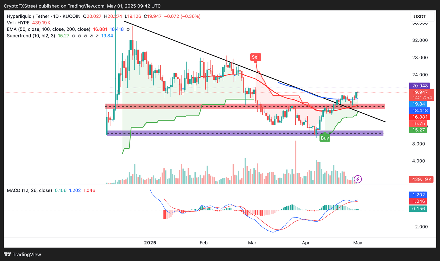 On the other hand, if HYPE fails to break above the $20.00 hurdle and instead slides below the 100-day EMA at $18.41, prices could drop toward the 50-day EMA at $16.88. This could be reflected by the MACD line crossing below the signal line, confirming a sell signal. The histograms could also turn red, hinting at losses and potentially leading HYPE to test its April 7 low at around $10.00.