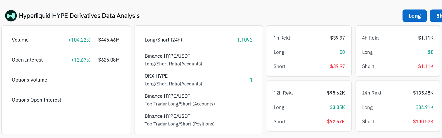 The long-to-short ratio of 1.1093 over the last 24 hours leans slightly bullish, with traders exhibiting a stronger long bias. Hyperliquid's 24-hour liquidations amount to about $135,000, with roughly $35,000 from long positions and $100,000 from shorts, indicating a short squeeze that likely supports the ongoing uptrend.