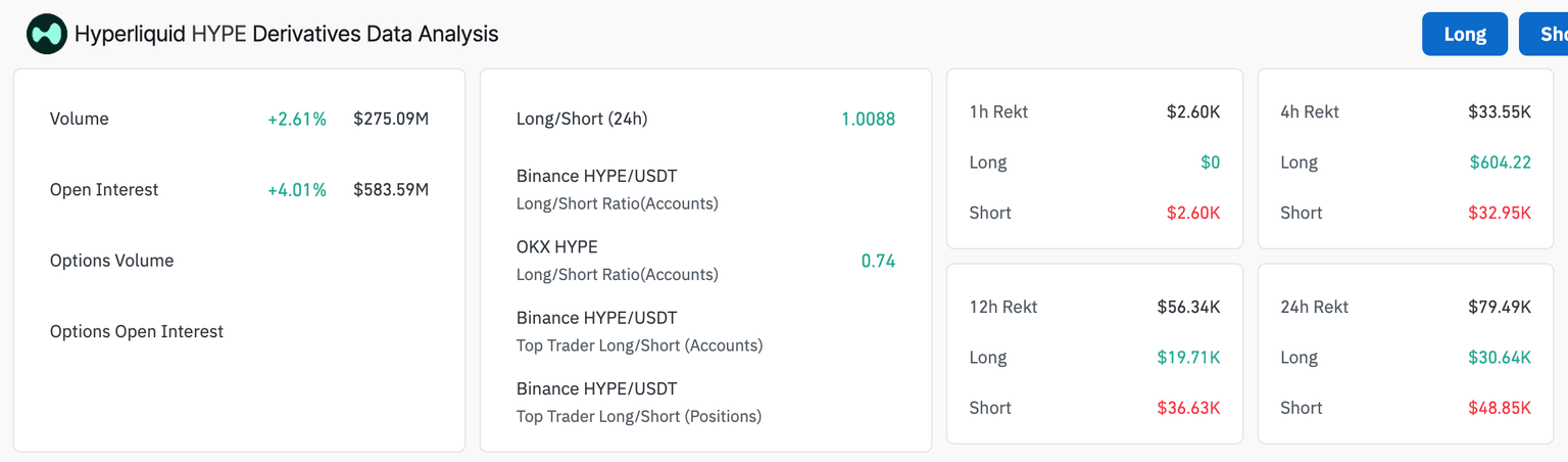 A 1:1 long-to-short ratio suggests that market sentiment is balanced, with traders equally split between bullish and bearish bets. However, liquidation data shows that more traders are closing their short positions, possibly leaning towards backing the uptrend in Hyperliquid’s price. Roughly $49,000 in short positions has been liquidated in the last 24 hours compared to approximately $31,000 in long positions.