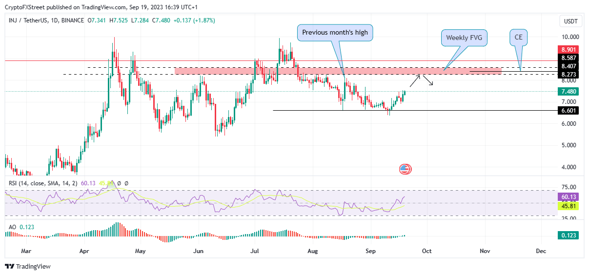- INJ could rise 10% to the weekly FVG at $8.273, filling the inefficiency before a potential pullback.