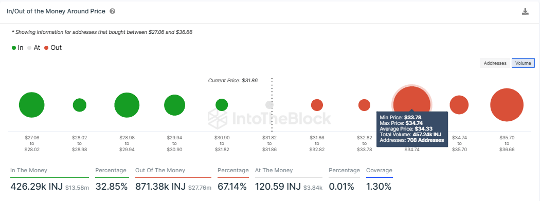 IntoTheBlock’s In/Out of the Money Around Price (IOMAP) model shows Injective price can expect formidable resistance between the $33.78 and $34.74 range, where 708 addresses hold 457,240 INJ tokens purchased at an average price of $34.33.
