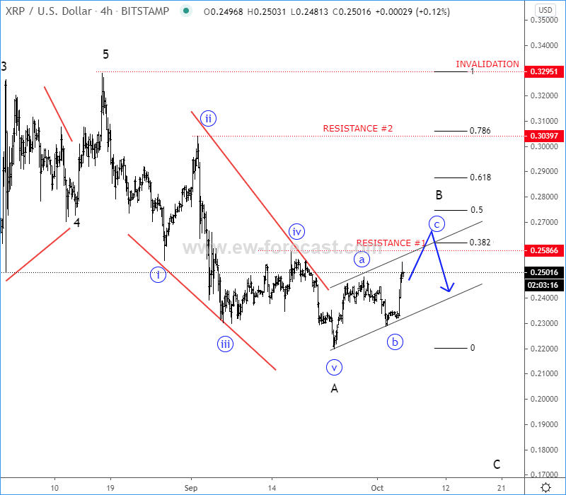 On the XRPUSD we can see this kind of pattern, as desribed above, completed in the wave A, which means, latest turn up from September lows can be part of a three-wave correction in wave B. We specifically see a three-wave a-b-c move, where wave c of B can retrace towards the Fib. ratio of 38.2 and 0.618 (0.260/0.290 area), where resistance and a new turn lower can be seen. However, in case of a deeper pullback in wave B, be aware of possible resistance at the 0.30 level.