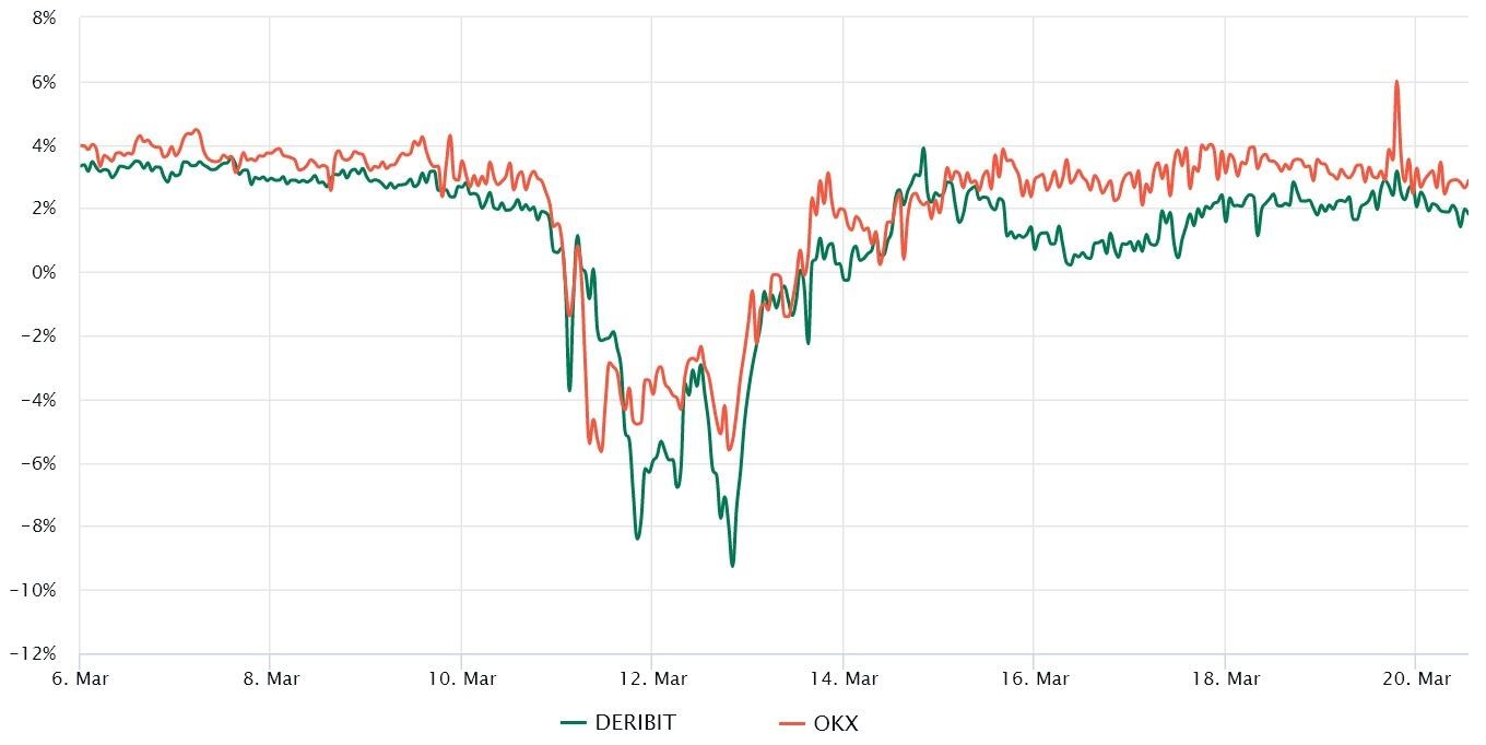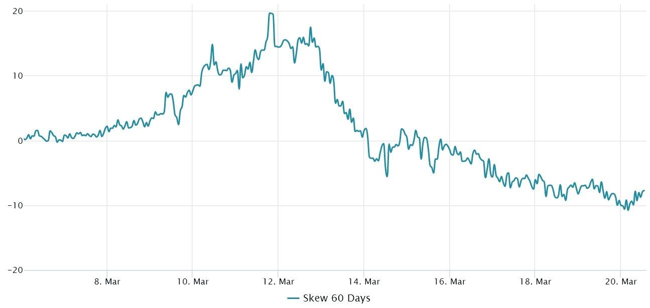 The delta skew crossed the neutral -8% threshold on March 19, indicating moderate optimism as neutral-to-bullish call options were in higher demand. The excitement, however, did not last long, as the 25% skew indicator is currently at -8%, which is the edge of a balanced situation. Nonetheless, it is the polar opposite of the previous week, when the skew reached 12% on March 13.