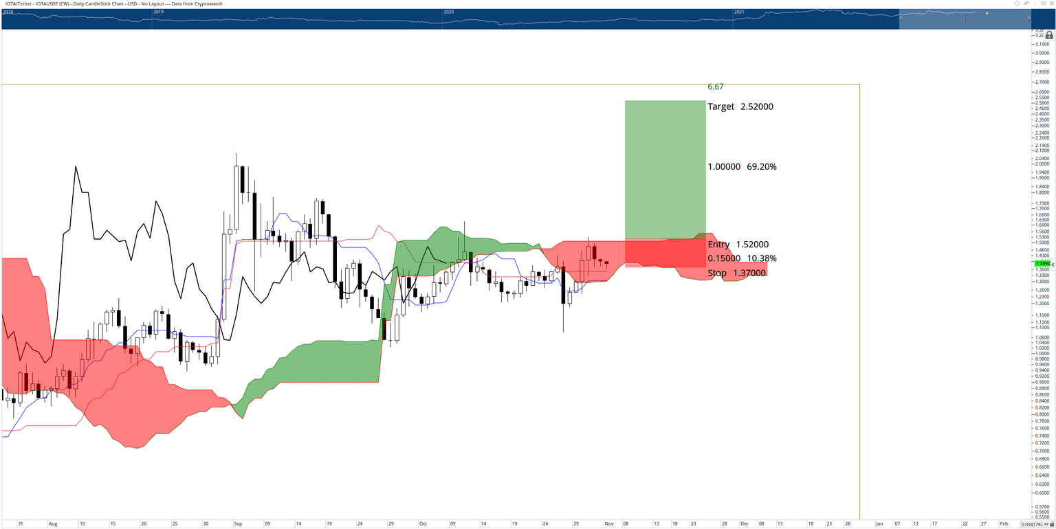 Bulls eye a hypothetical long entry above the Cloud at $1.52. A daily close at or slightly above $1.52 would confirm IOTA price in an Ideal Bullish Ichimoku Breakout entry. The stop loss would be slightly below the Cloud at $1.38 with a projected profit target at $2.52 – slightly below the all-time high. A trailing stop would help protect any implied profits made due to a swift move above the Cloud.