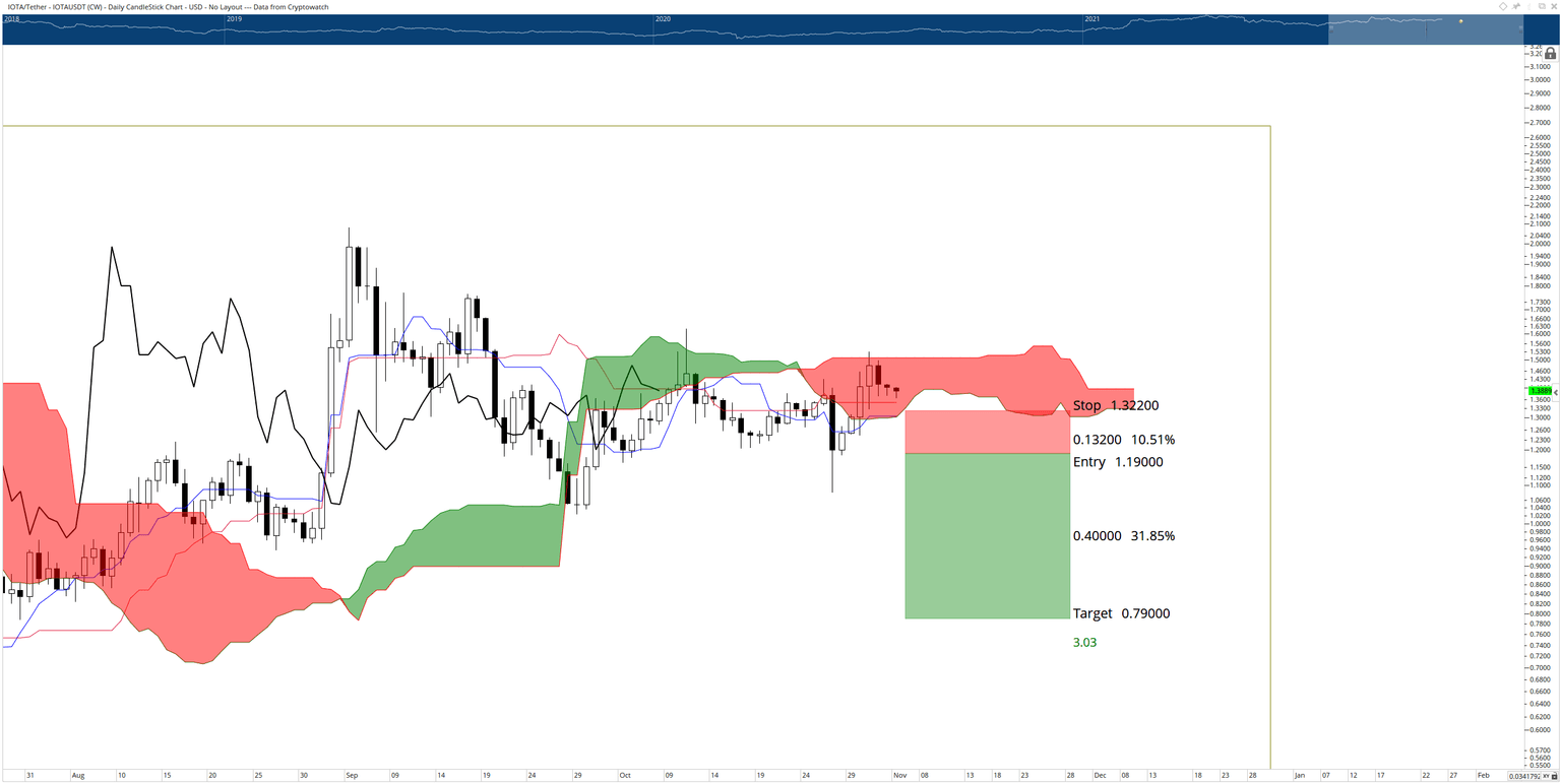 Significant support for IOTA price exists between$1.30 and $1.35. The Tenkan-Sen, Kijun-Sen, Senkou Span A, and 2021 Volume Point Of Control all reside within that price range. If support fails in that price range, then a potential short setup develops with an entry at a daily close near $1.19, a stop loss at $1.32 and a profit target at $0.79. A tight trailing stop would help limit any potential profit, especially as dip buyers may step in very soon after the entry is triggered.