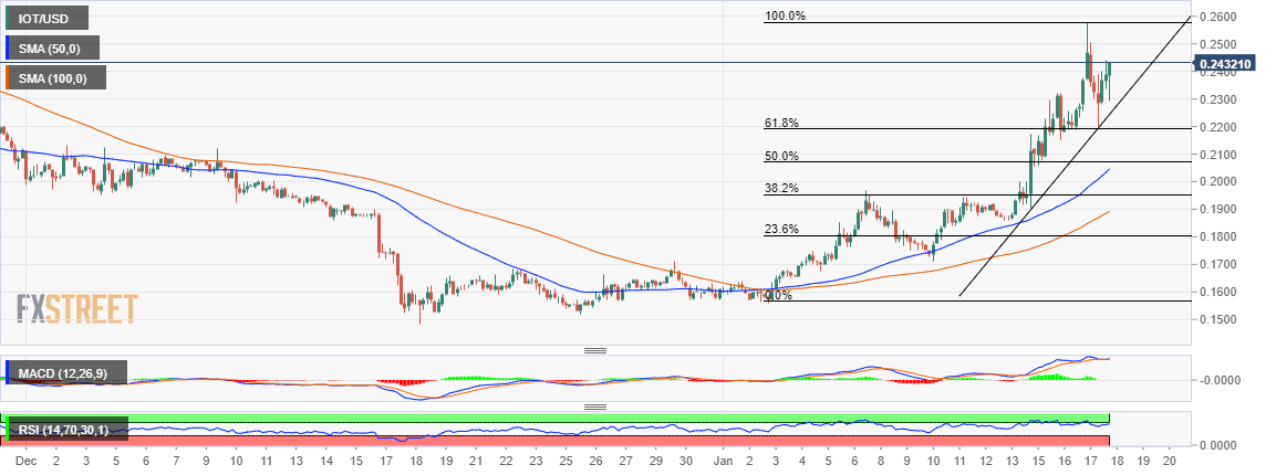 IOTA is among the very few cryptocurrencies in the green on Saturday. Generally, the market is in a bearish correction, especially after Friday’s brief surge failed to break above key resistance areas and sustain the accrued gains. IOTA tested the support at the 61.8% Fib retracement level spanning from the last high at $0.2579 to a swing low of $0.1565 close to $0.22.