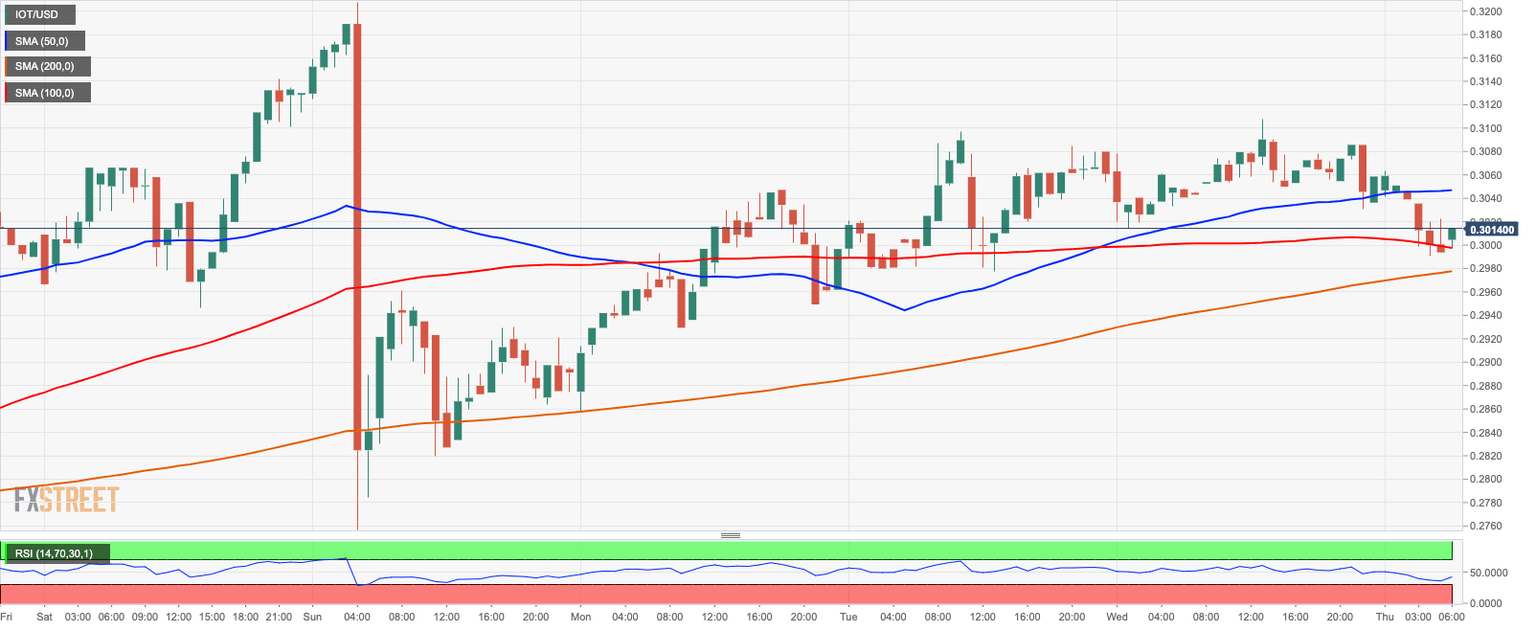 IOTA is the 24th largest digital asset with the current market value of $842 million. The coin has stayed mostly unchanged since the beginning of Thursday and lost 1.4% in the recent 24 hours. At the time of writing, IOT/USD is changing hands at marginally above $0.3014. The coin has been range-bound with bullish bias after a collapse to $0.2963.