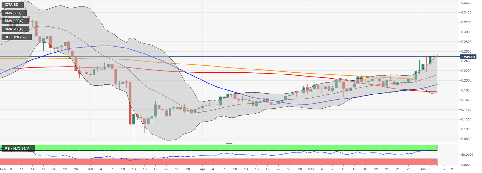 If the downside momentum gains traction, IOT/USD may retreat to $0.2150 that served as a resistance at the beginning of May. Also, this area is reinforced by the middle line of the daily Bollinger Band.