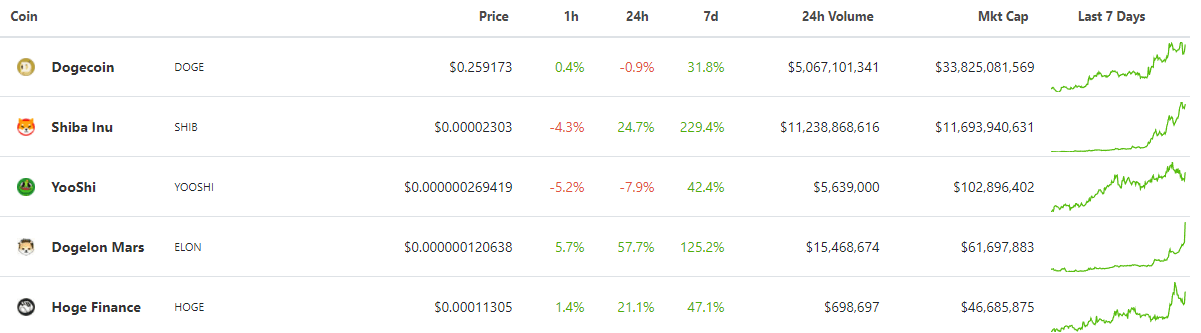SHIB may have notched the largest percentage gain, but DOGE remains the top dog of the pack with the furthest reach and a market cap of $33.26 billion.
