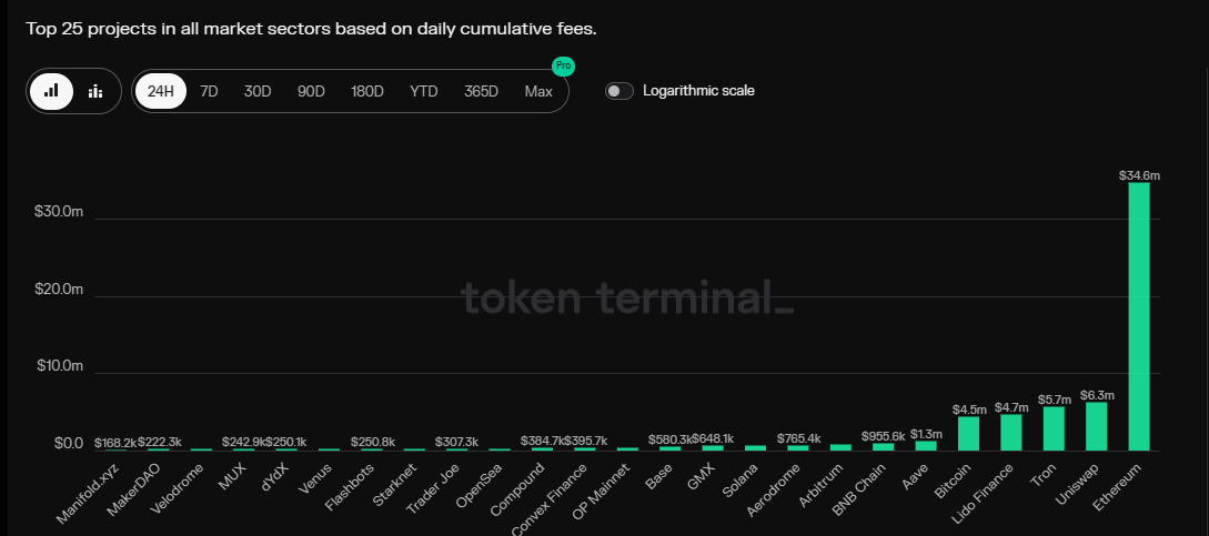 In the meantime, data according to Token Terminal shows that the Ethereum network leads by far with $34.6 million on metrics of the top 25 projects in all market sectors based on daily cumulative fees. The Uniswap network follows at a distance with $6.3 million.