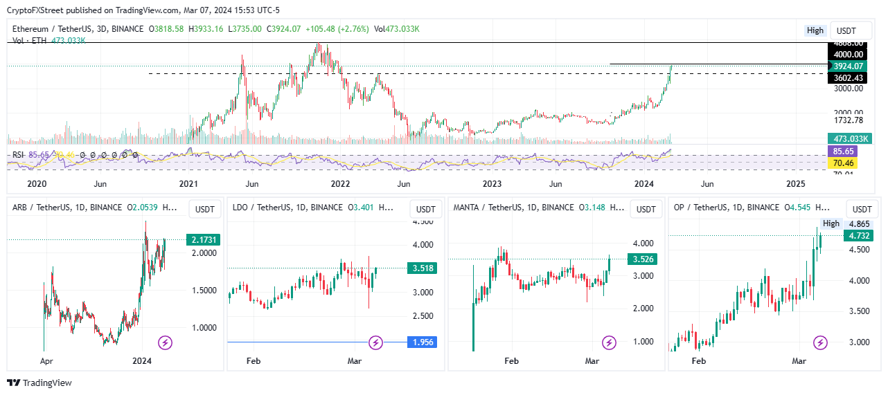 ETH/USDT 3-day chart, ARB/USDT 1-day chart, LDO/USDT 1-day chart, MANTA/USDT 1-day chart, OP/USDT 1-day chart