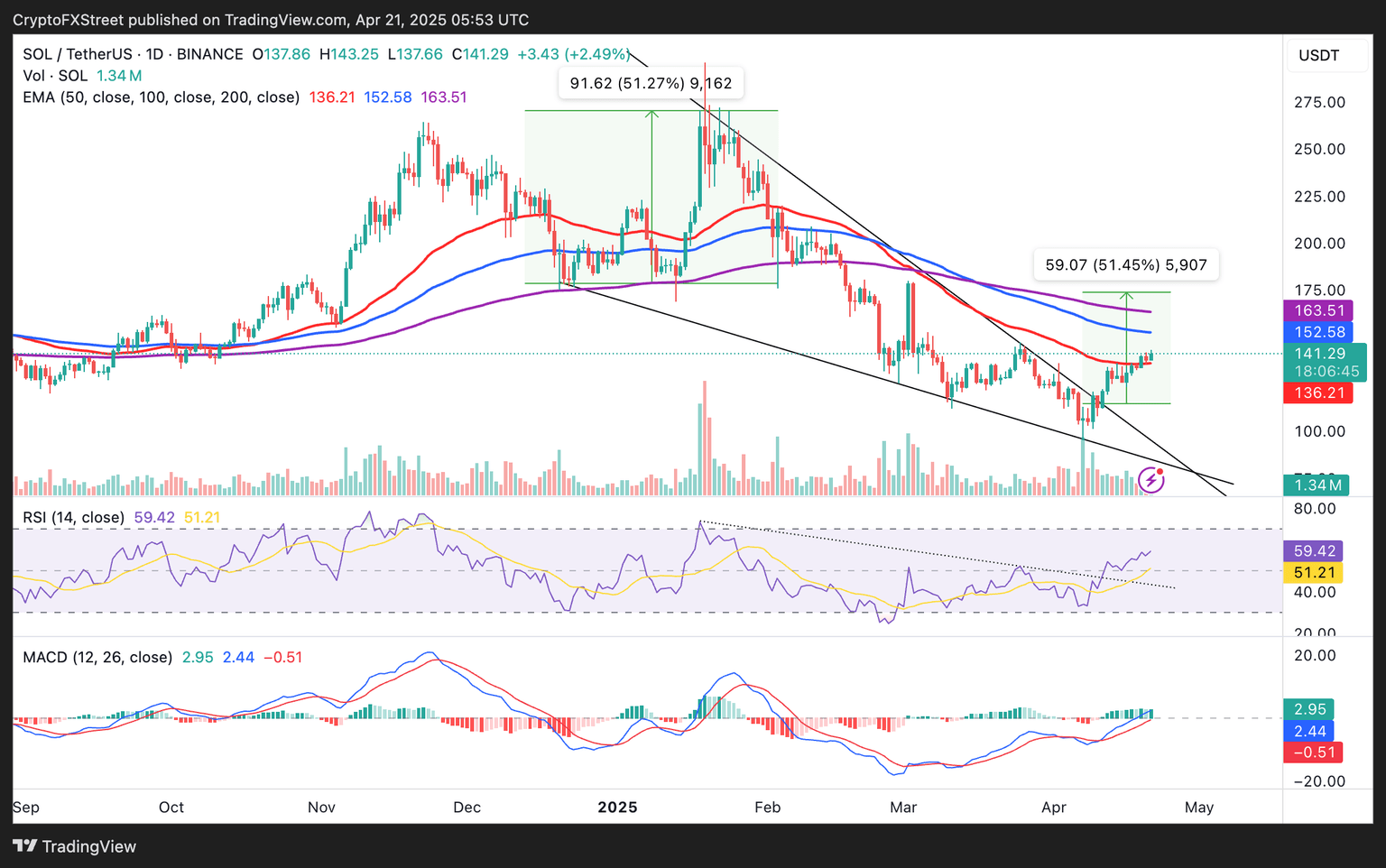 Solana's price pushes for gains above a wedge pattern's breakout explored in the previous week. The growing interest among traders caused an increase in trading volume, elevating SOL past the 50-day Exponential Moving Average (EMA) indicator before successfully taking on resistance at $140.