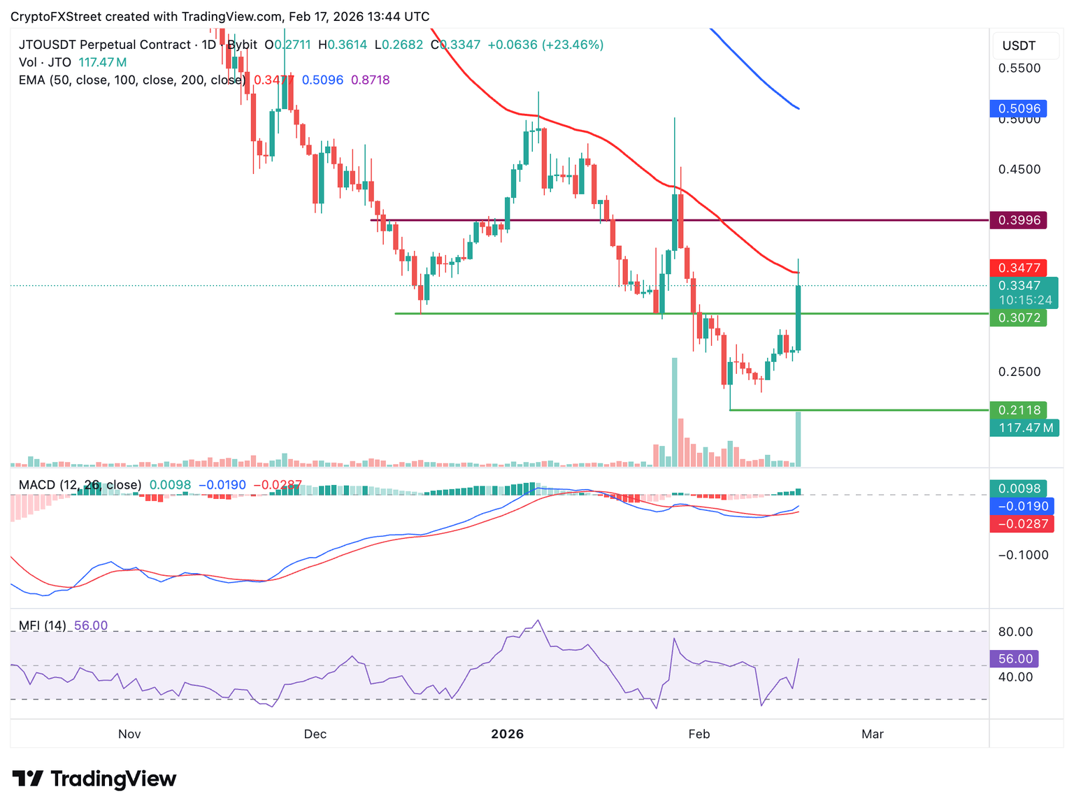 Jito (JTO) has accelerated its rebound by more than 23%, trading at around $0.33 at the time of writing on Tuesday. The isolated price uptick comes amid widespread drawdowns in the crypto market and weak sentiment.