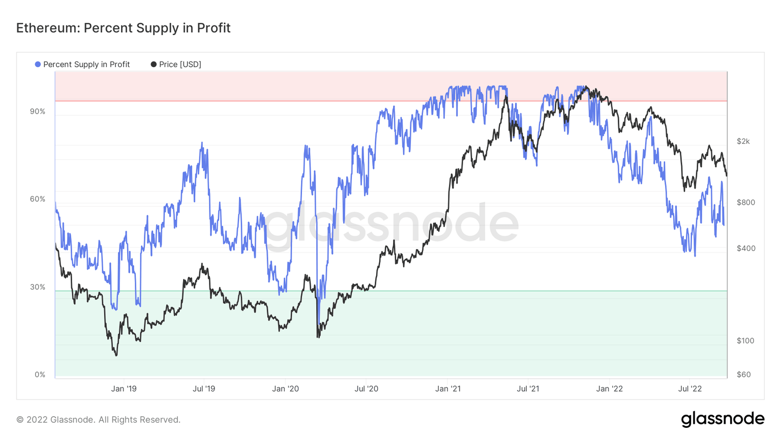 The same volatility has kept Ethereum from experiencing a market bottom, which is usually a sign of a trend reversal. When the Percent Supply in Profit indicator touches the green zone (chart below), the overall supply in profit might witness some bullishness. This will, in effect, create the conditions necessary to bring profits back, consequently leading to a recovery in ETH’s price.