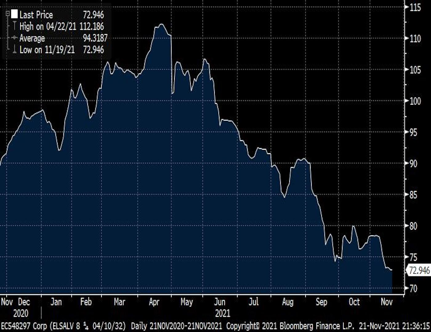 Price graph of El Salvador's dollar-denominated bonds due in 2032. (Bloomberg)