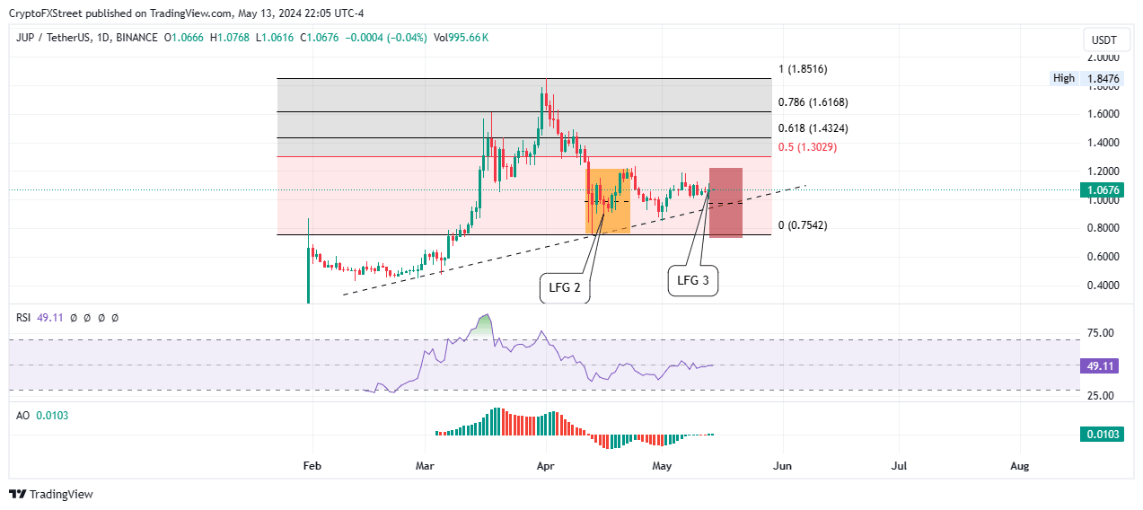 At the time of writing, JUP token is trading for $1.0676, holding well above an ascending trendline. As part of a typical ‘buy the rumor’ situation, the DEX token’s market value could rise ahead of May 22 before a ‘sell the news’ event wipes out the ground covered.
