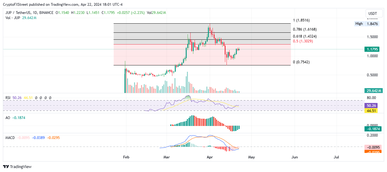 At the time of writing, Jupiter’s JUP token is trading for $1.1673. If the JUP bulls are able to hold the Jupiter token price above the 50% Fibonacci placeholder of $1.3029, it would entice more buy orders to catapult the price high. In the meantime, however, the likely play is a rejection below the 50% Fibonacci placeholder, which could see JUP price drop to the $1.0000 psychological level.