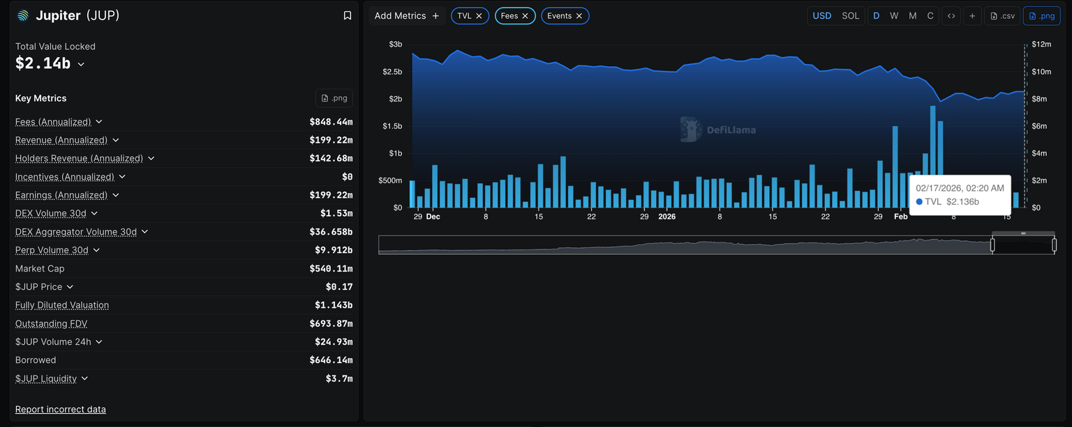 DeFiLlama data shows the TVL on Jupiter stands at $2.14 billion on Tuesday, up from $1.95 billion on February 6. This reflects an increase in user deposits on Jupiter, indicating fresh inflow and user interest.
