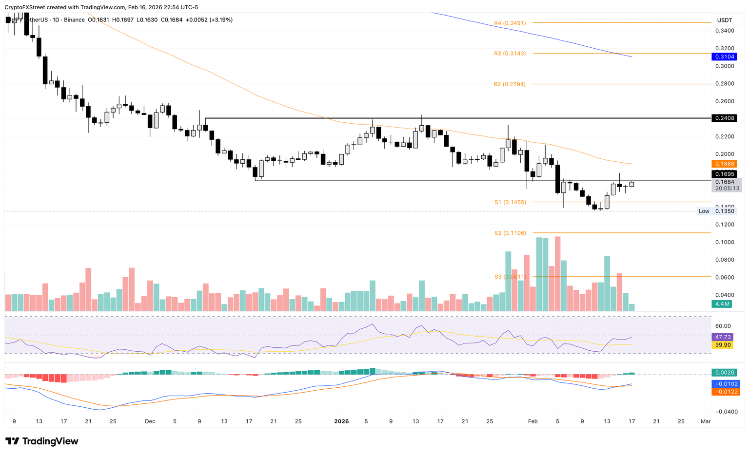 A decisive close above this level would likely extend the rally to the 50-day EMA at $0.1888, followed by a higher zone at $0.2408, last rested on January 14.