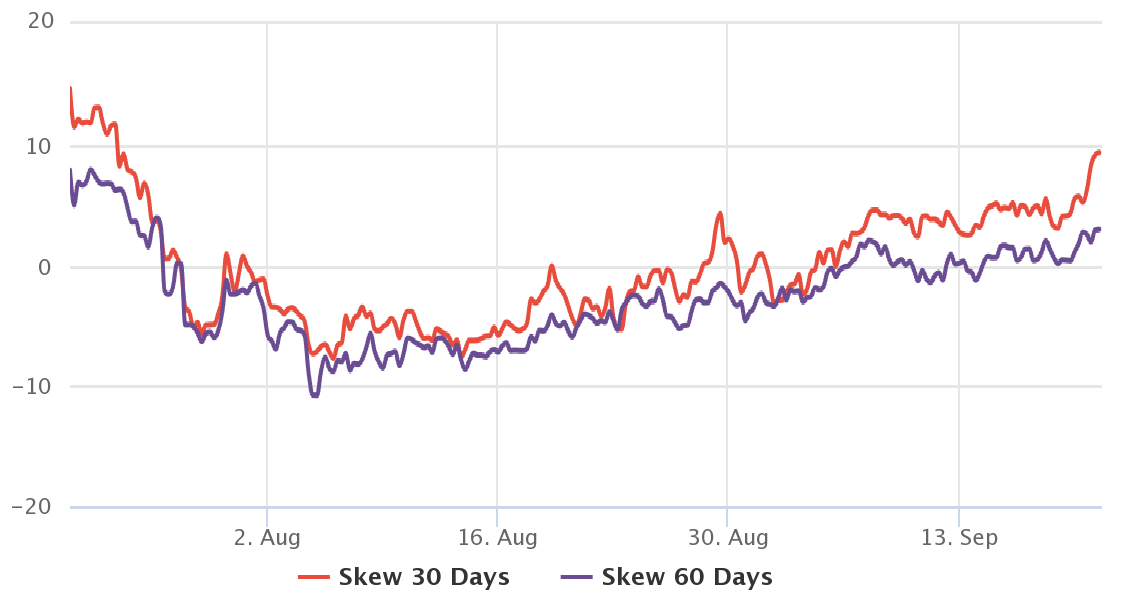 A skew indicator oscillating between -7% and +7% is usually deemed neutral. On the other hand, the metric shifts above this range whenever the downside protection is more costly, typically a "fear" indicator.