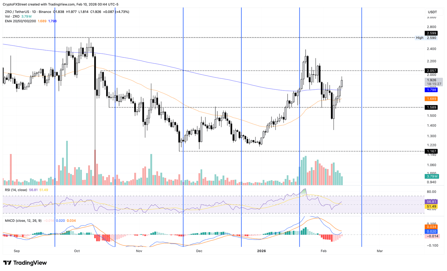 The recovery run in ZRO token extends for the fifth consecutive day with bulls targeting the October 13 high at $2.05. A decisive close above this level could extend the rally towards the $2.39 peak from January 23.