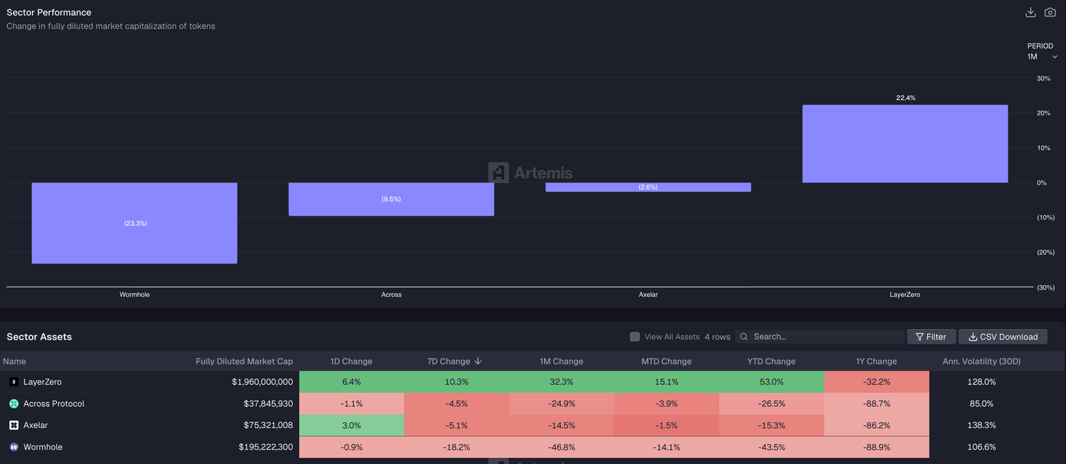 Artemis data show that bridge tokens, focused on cross-chain interoperability, outpaced the broader cryptocurrency market over the last seven days, driven mainly by LayerZero, which posted 10% weekly and 32% monthly gains.