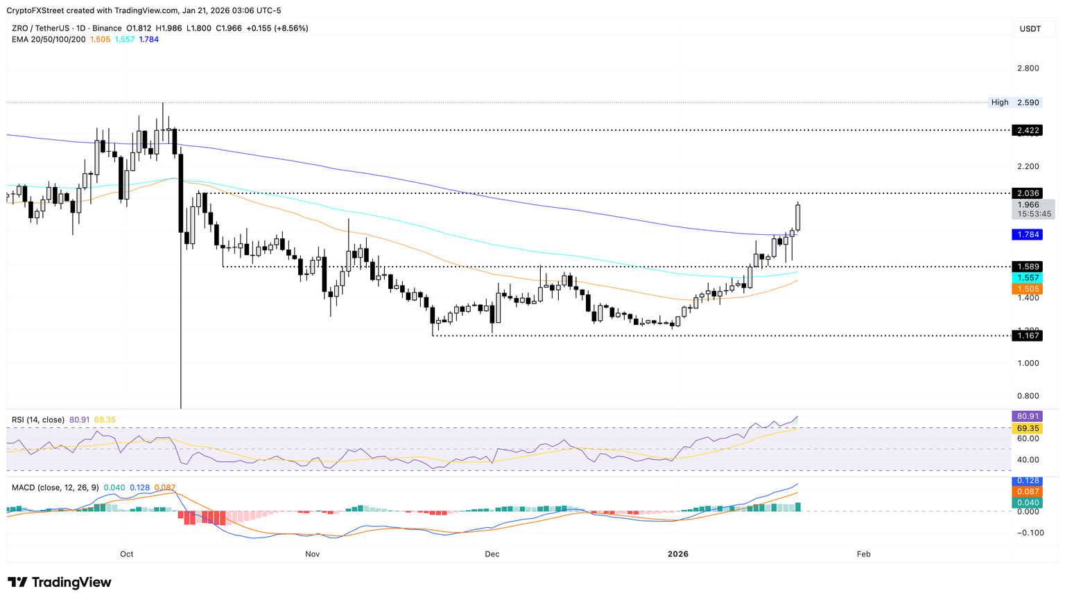 If ZRO extends its consistent upward trend, the October 13 close at $2.036 could serve as crucial resistance near a psychological level.