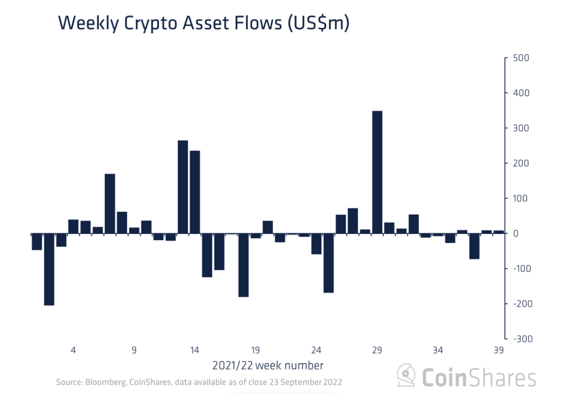 - Coinshares’ weekly report highlights the total amount of money moved around by these institutions has been consistently disappointing.