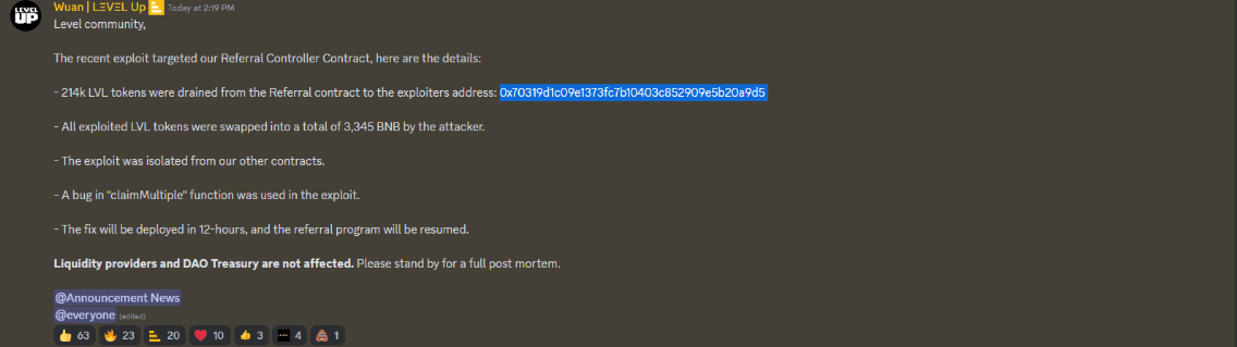 It seems the @Level__Finance's LevelReferralControllerV2 contract has a bug that allows for repeated referral claims from the same epoch. So far 214k LVLs have been drained and swapped into 3,345 BNB (~1M)