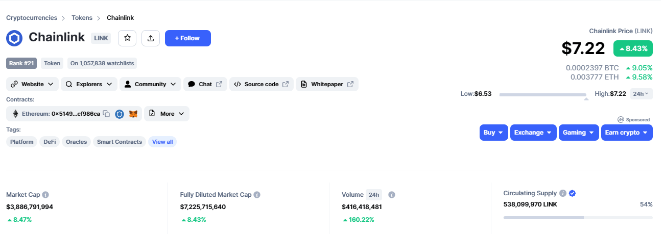 LINK, the ticker token for the Chainlink ecosystem, is enjoying the rewards of a bullish market, rising almost 10% in market value alongside a 160% increase in 24-hour trading volume.