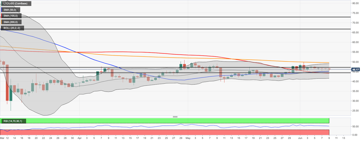 On the daily charts, LTC is dormant in a tight range with bearish bias. On June 2, the coin attempted a recovery towards $50.00, however, daily SMA200 located on approach to that barrier discouraged the bulls and triggered the downside correction. LTC/USD returned to the previous range limited by 47.00 on the upside and $44.00 on the downside and has been sitting there ever since.