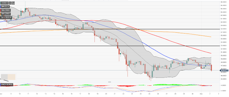 On the downside, a sharp decline towards the intraday low of $45.25 will signal that the bearish trend is resumed and bring November 25 low of $42.35 back into focus. This area is likely to slow down the sell-off; however, once it is cleared, a psychological $40.00 will come into focus.