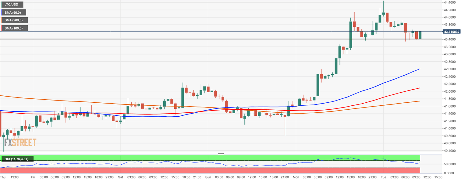 On the intraday charts, LTC/USD has created a head-and-shoulders pattern, which is a precursor to the downside correction. If the price moves below the neckline at $43.40, the bearish momentum may gain traction with the next focus on $42.60. This support is reinforced by 1-hour SMA50. Once it is out of the way, the sell-off will continue towards 1-hour SMA100 at $42.00 and SMA200 at $41.70.