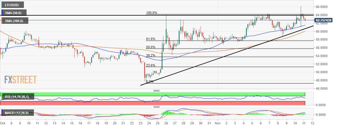 A broader look on the chart shows LTC having maintained an uptrend despite the drop from highs around $66. Besides, a third attempt to snap out of the rising triangle has been met with increasing selling pressure. LTC/USD is hovering above $62 as sellers swing into action with a target set on refreshing $58 support.