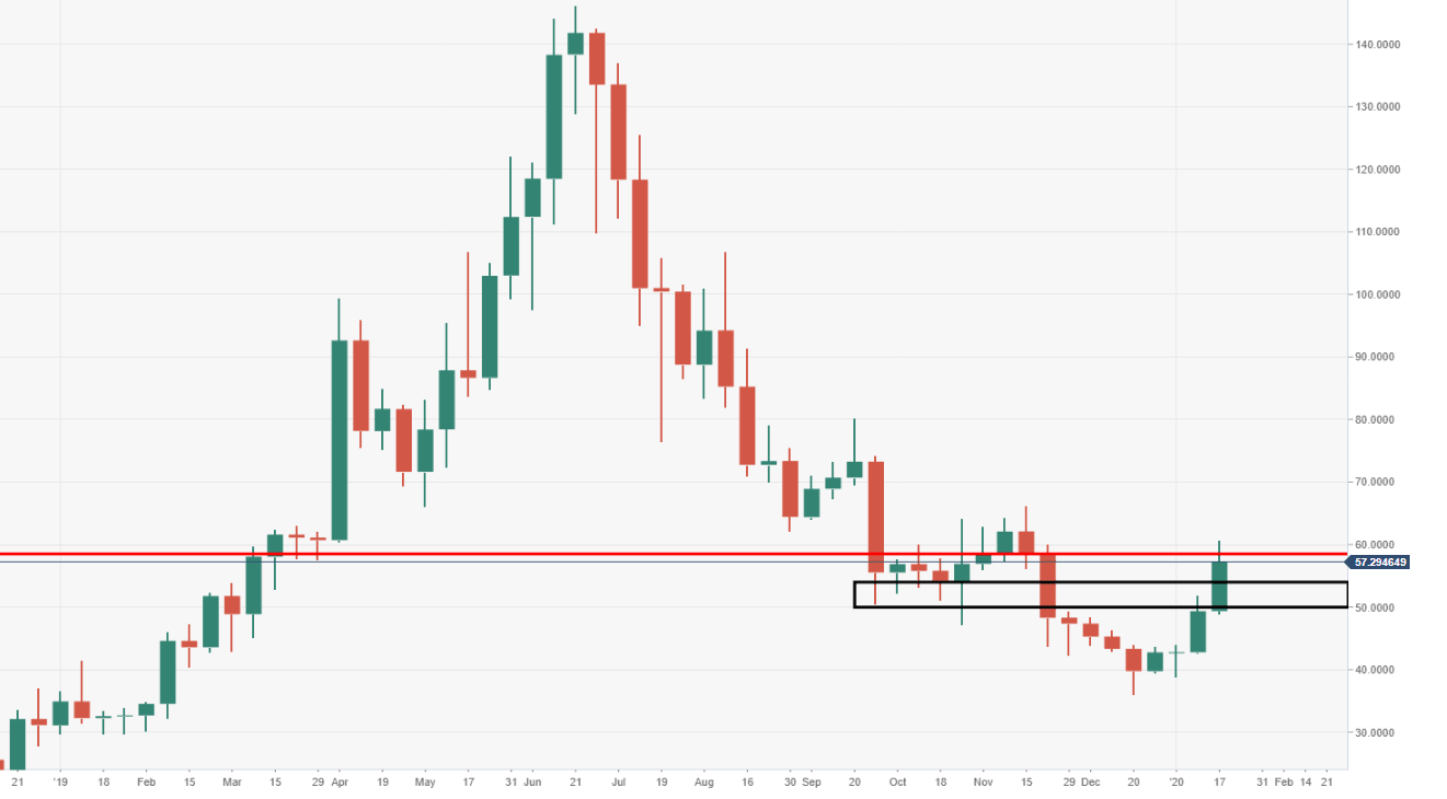 Market bulls are attempting to convincingly break down daily supply, $56-60 range. It has not traded above since 14 November.