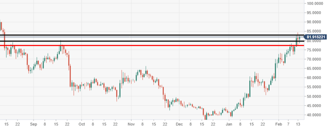 The price has been forced to retest $77 for support, a level that had capped the price from 8-11 February.