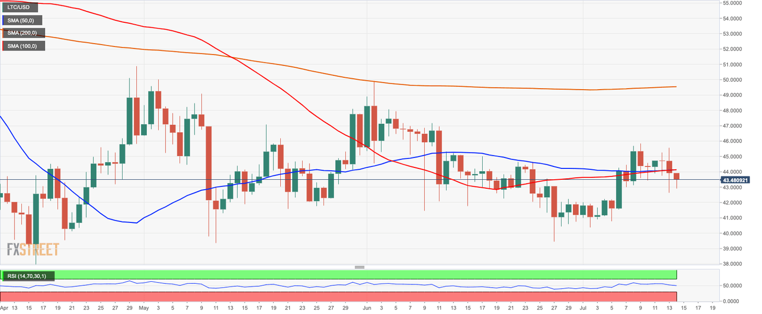 Litecoin (LTC) dropped below $44.00 on Monday, and now this barrier serves as a strong resistance level for the coin. A combination of daily SMA50 and SMA100 located above $44.00 make it a hard target for the bulls. However, once it is broken, the recovery may be extended towards Monday's high of $45.50 and $45.80. This level stopped the upside momentum during the previous week and also served as strong resistance in the middle of June.