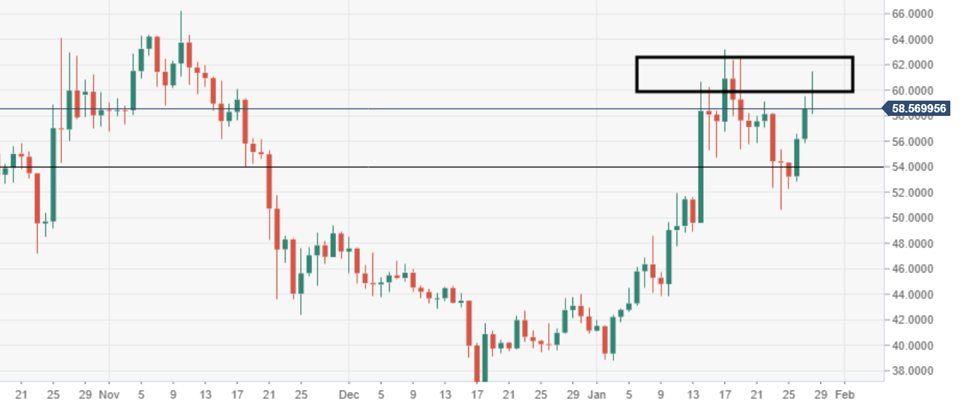 Should the last week’s high area be broken down around $62, would likely encourage greater buying momentum.