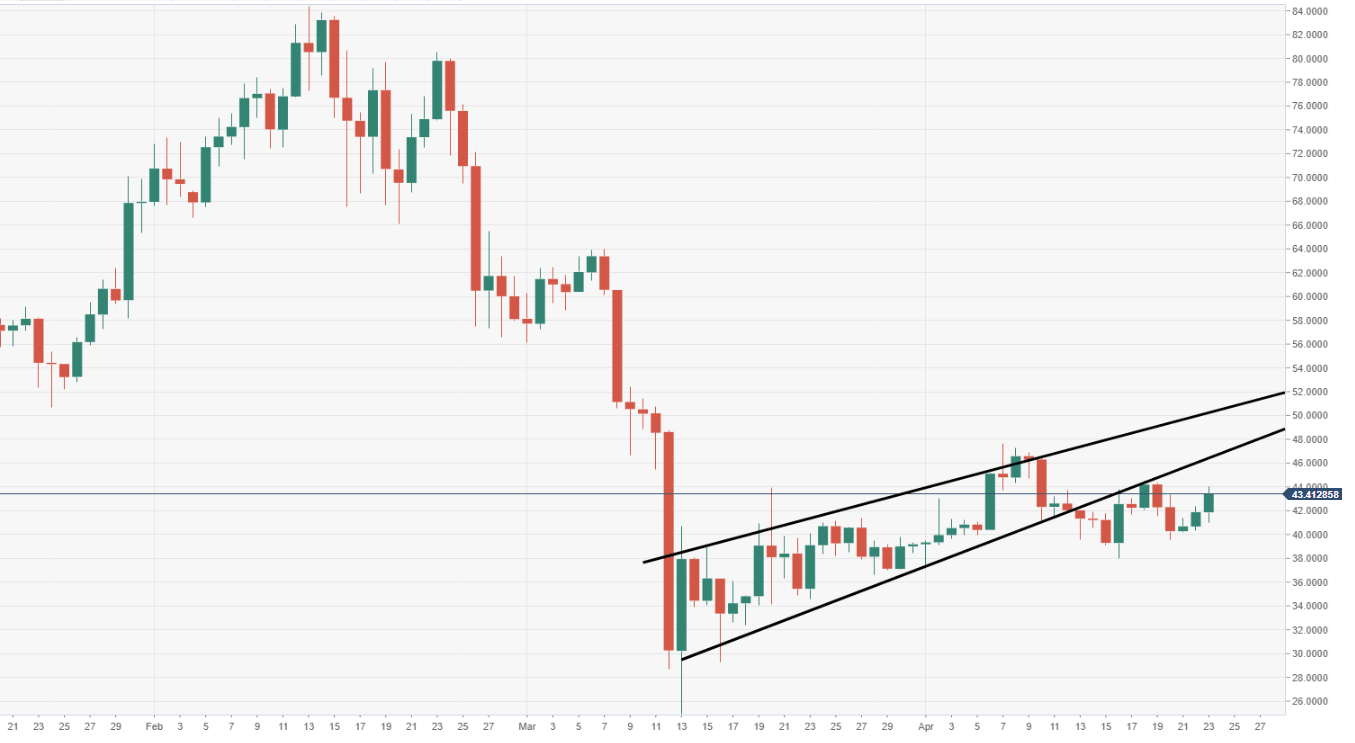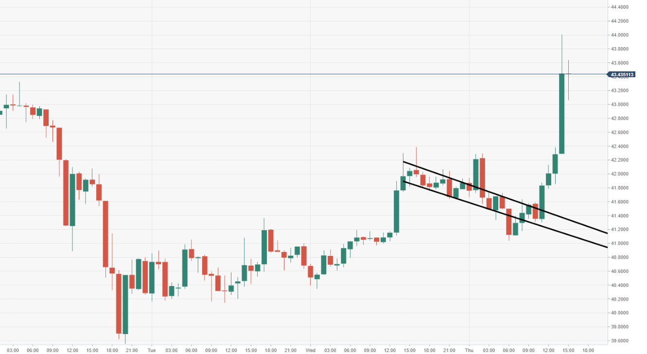 - The price is set for another critical test of a big area of resistance just ahead at $45-46.