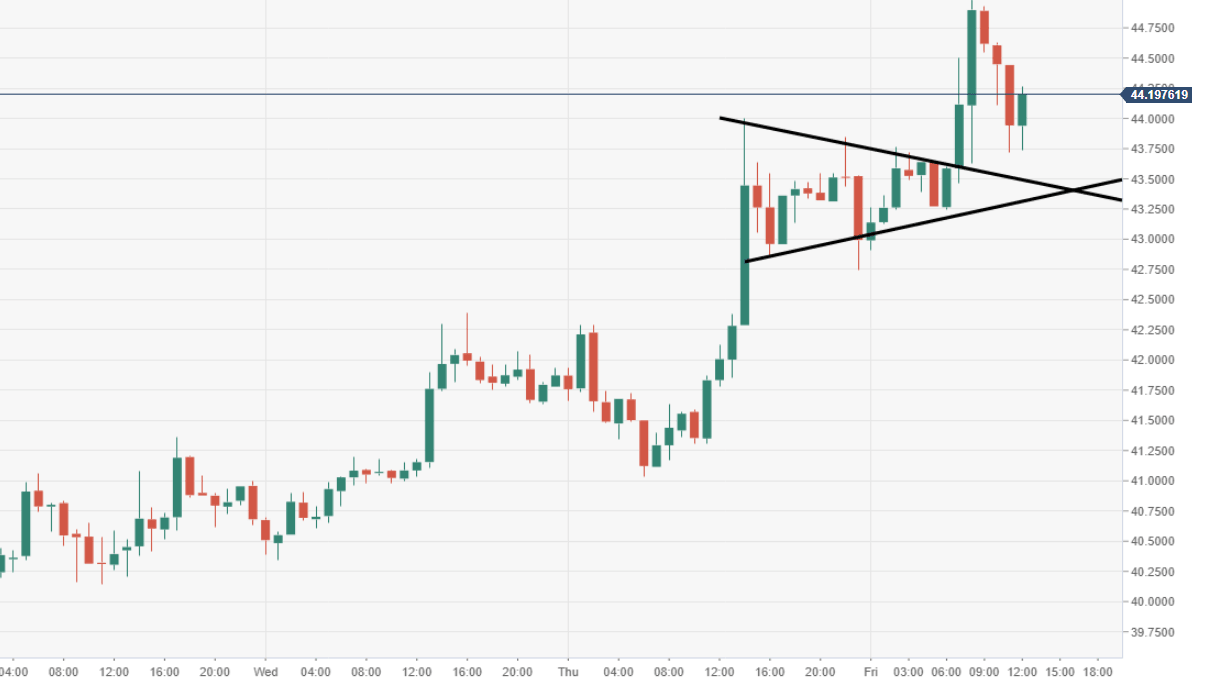 The bulls are pressing for a breakout of a narrowing daily range block, high at $45, low down at $40.