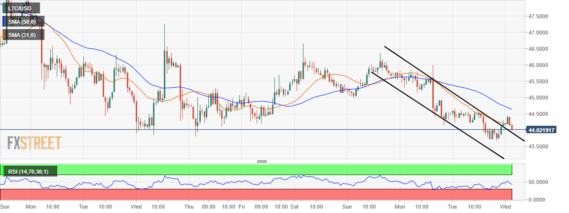 - Technical levels are mostly lethargic; LTC/USD targets $43.50 support on the downside.