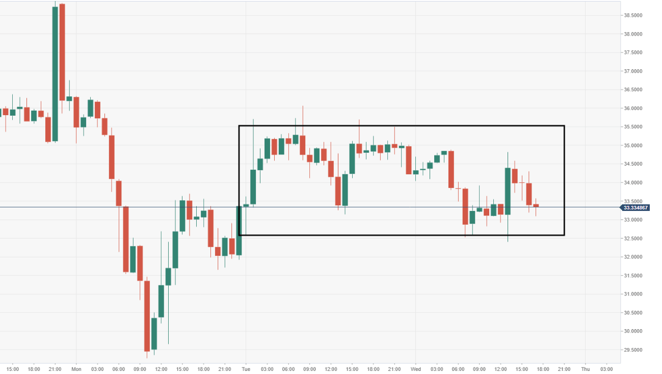 rice action is narrowing within a range-block, the low support down at $32.50, resistance to the upside notable at $35.00.