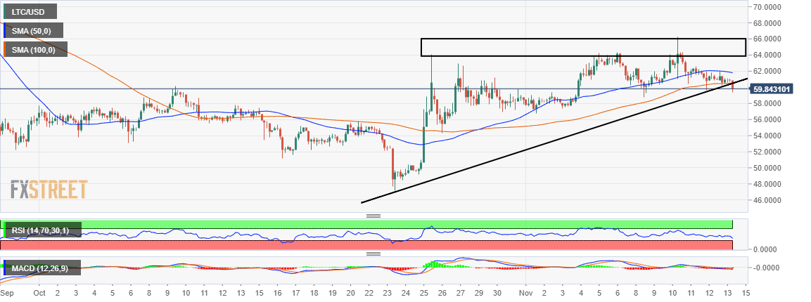 - Litecoin embarks on gains trimming exercise targeting $50 on the downside.