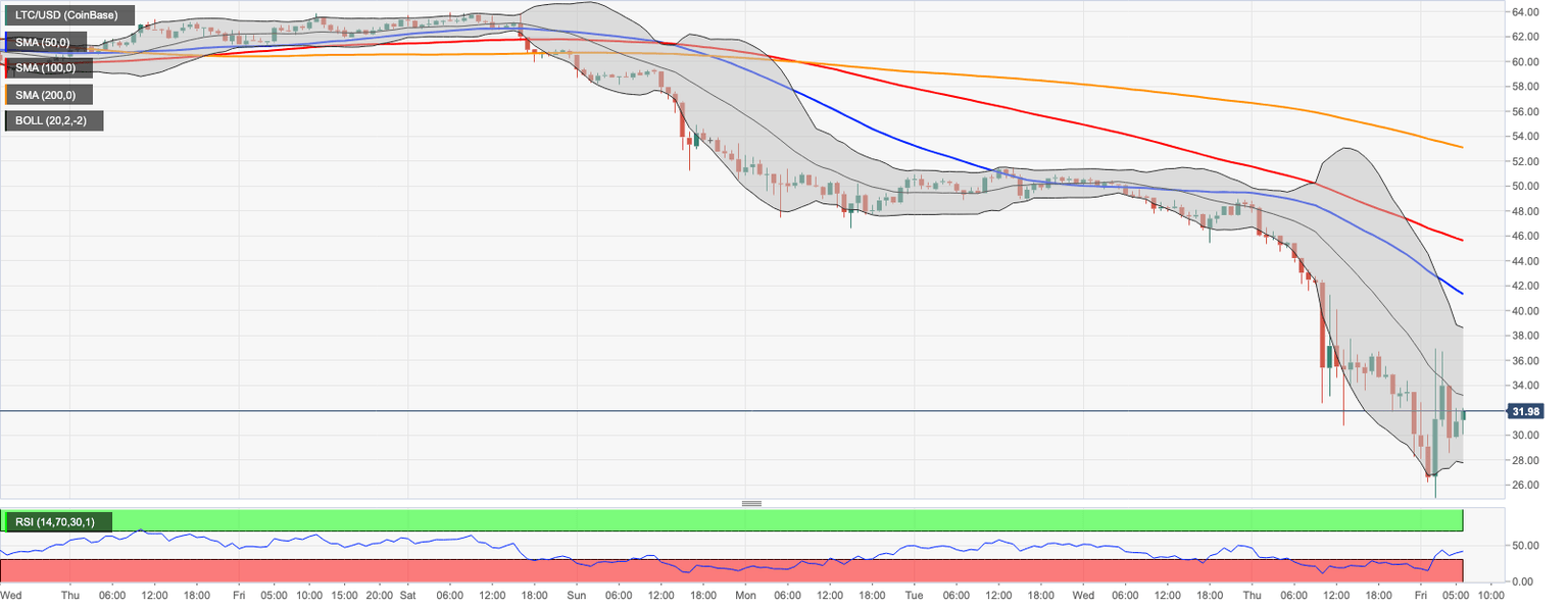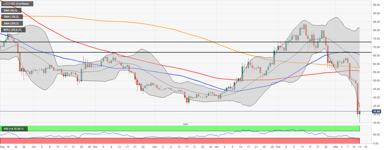 Litecoin, now the third-largest digital asset with the current market value of $2 billion, has lost nearly 30% of its value in the recent 24 hours moving in sync with the market. LTC/USD hit the intraday low at $25.00, which is the lowest level since December 2018. At the time of writing, LTC/USD is changing hands at $31.50.
