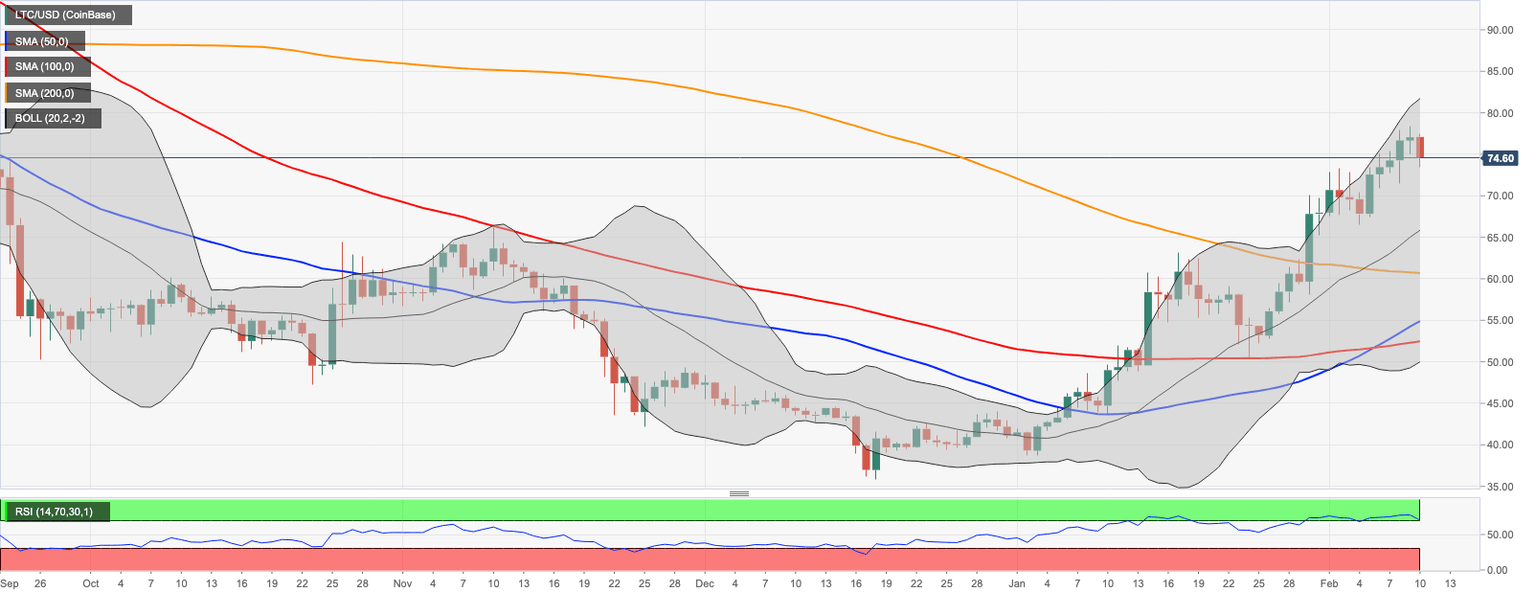 Litecoin stopped a five-day long rally on Monday. The sixth0largest digital asset with the current market value of $4.8 billion has retreated from Sunday's high of $78.45 to trade at $74.34. The coin has lost 3.4% of its value on a day-to-day basis.