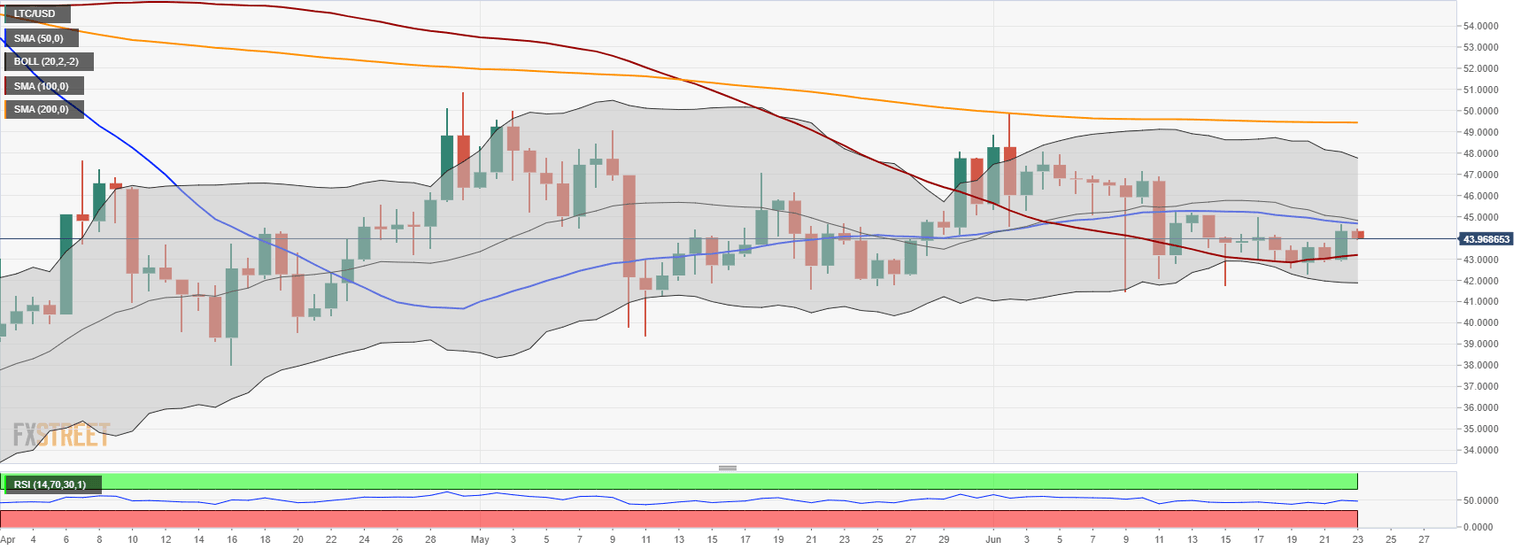 On the daily chart, LTC/USD is supported by SMA100 located on approach to the above-mentioned support of $43.00. This technical barrier has limited the sell-off since June 11, as numerous attempts to break below this level were heavily bought. The next support lines come at $41.50 and psychological $40.00. The later barrier is reinforced by May 11 low at $39.50.